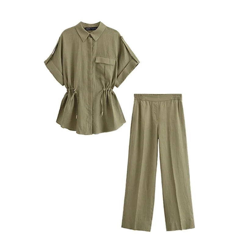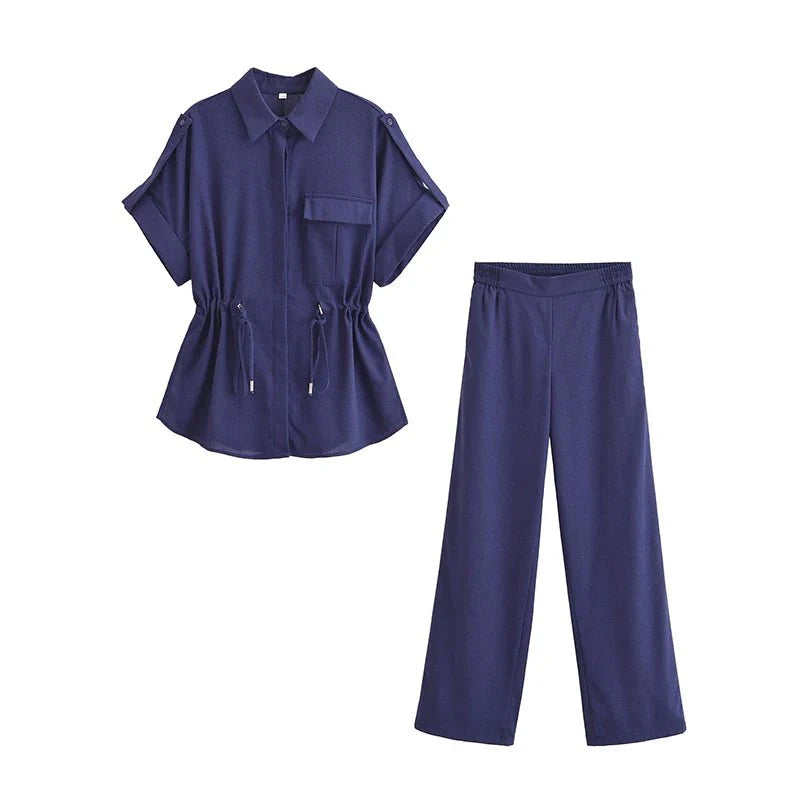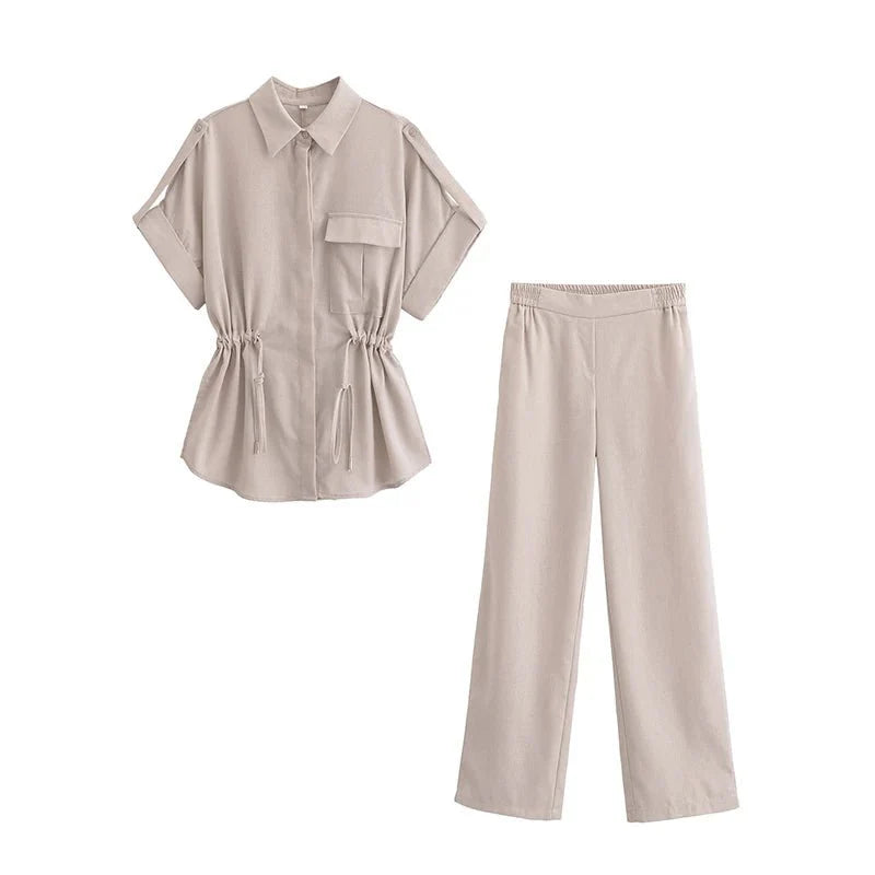 Lichte a luchtige zomer set bestaande uit losse top a bijpassende broek. Stijlvolle keuze voor casual zomer uitstraling, ideaal op vakantie of vrije dagen in de stad.